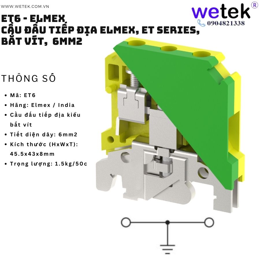 2/ Cầu đấu tiếp địa Elmex, ET Series, bắt vít, 6mm2 Mã: ET6 (Phụ kiện: Nhãn tên mã KN8 (10c) ) Made in India